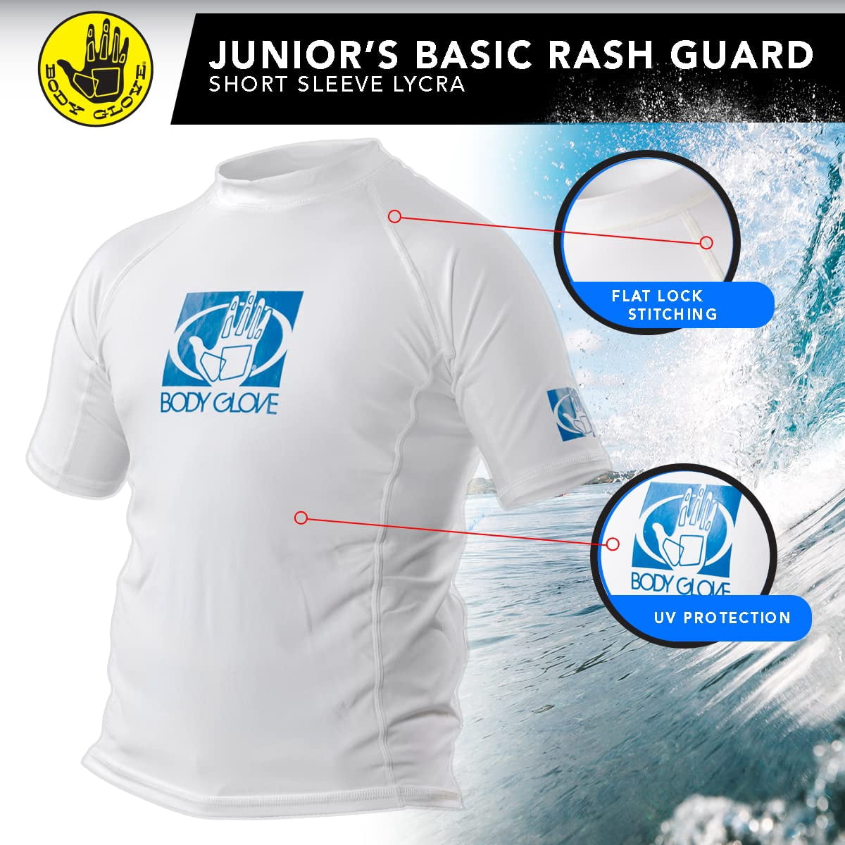 Body Glove Wetsuit Junior Basic Fitted Short Arm Rash Guard, White, 8Body Glove performance rash guards offer strategically placed moisture wicking performance fabric throughout the body and arms. The non-chafe flat lock seams and double needle wrist, arm, and waist finish with the low profile crew neck creates a comfortable fit. The vented side and upper back panels provide enhanced breathability and temperature management system and offers UV protection. Body Glove since 1953 surf, body board, SUP, paddling, kayak, wake, ski, tubing, wake surfing, snorkeling, scuba, dive whatever you do in the water.